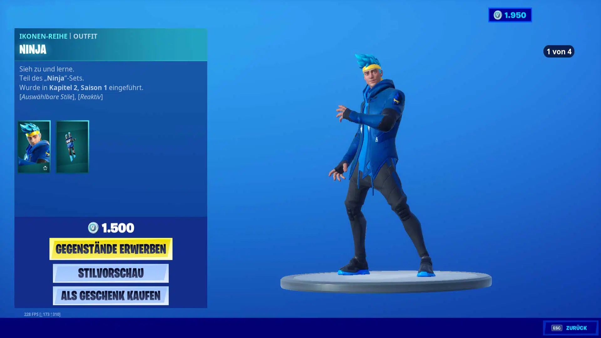 Das Set komplettieren das Emote „Ninjastil“ (weitere 300 V-Bucks) und der Spitzhacken-Ersatz „Zwillingskatanas“ (weitere 800 V-Bucks). Wer also alle Ninja bezogenen Gegenstände in seine Fortnite Sammlung aufnehmen möchte, muss 2.600 V-Bucks investieren. Wer sich die Währung für Echtgeld zulegt, zahlt für das 2.500 + 300 Bonus V-Bucks Paket im Shop 24,99 Euro.