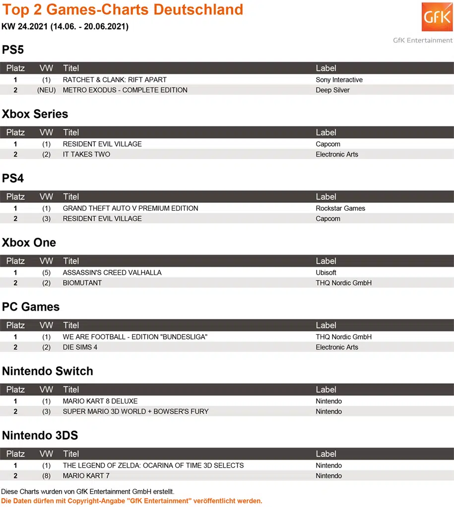 Getoppt wird Metro Exodus allerdings von den Dauerrennern Ratchet & Clank: Rift Apart sowie Resident Evil Village, die auch die vorherigen Wochen dominierten.