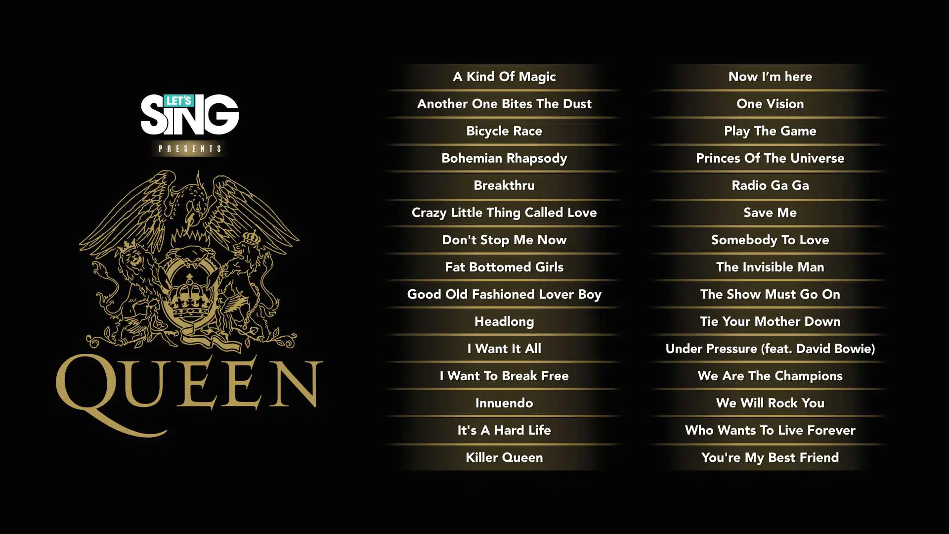 Die für diese besondere Ausgabe der Let‘s Sing-Serie mit Highlights prall gefüllte Trackliste nimmt Spieler mit auf eine Reise durch zahlreiche Dekaden, in denen Songs wie “We Will Rock You”, “Under Pressure”, “A Kind Of Magic”, “The Show Must Go On” und viele, viele mehr keinen noch so großen Musikwunsch unerfüllt ließen.