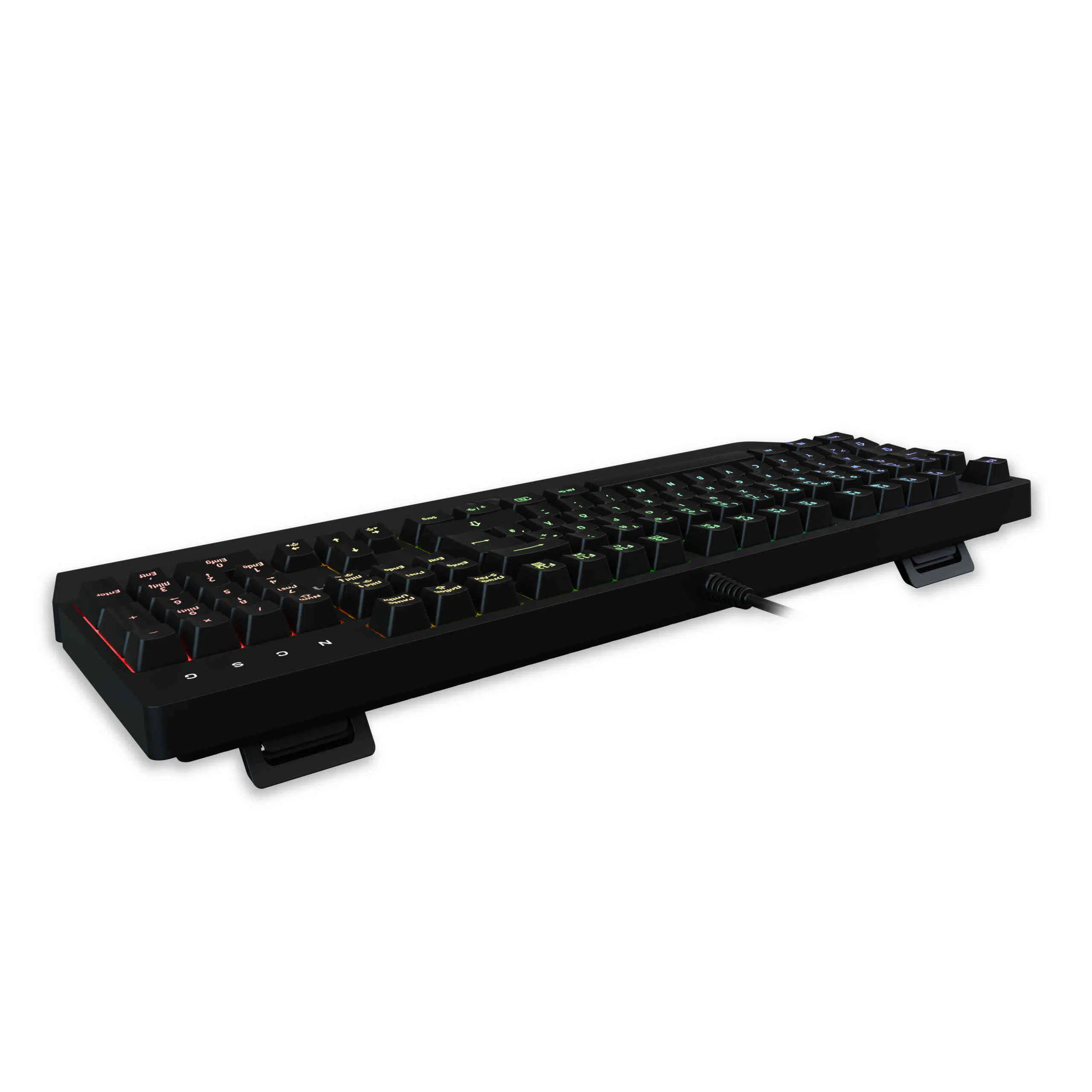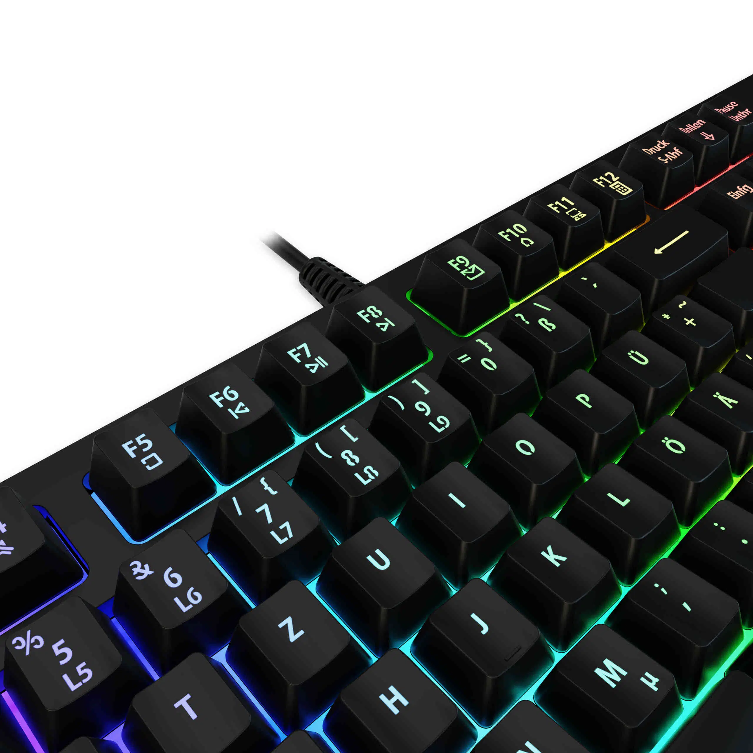Das strapazierfähige ABS Gehäuse wird kombiniert mit einer robusten Metallplatte und soll besonders leicht zu reinigen sein. Die Switches bieten eine hohe Präzision und können mit einem 19-Tasten-Rollover und Anti-Ghosting aufwarten. Damit während des Spielens nichts verrutscht, sind an der Unterseite Anti-Rutsch-Füße für den nötigen Grip angebracht.