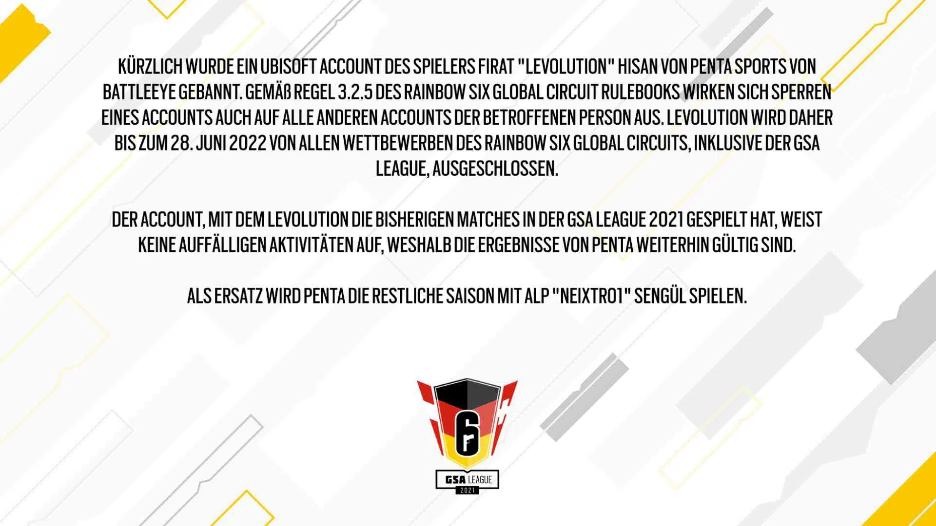 Wie Rainbow Six Esports DE auf Twitter am gestrigen Donnerstag, dem 08. Juli 2021 bekannt gab, wird PENTAs ‘Levolution’ bis zum 28. Juni 2022 wegen Cheatings von der GSA ausgeschlossen. Hierbei betonte Ubisoft, dass auf dem in den offiziellen Matches verwendeten Account von Levolution keine Auffälligkeiten gefunden wurden.